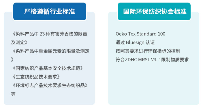 公司嚴(yán)格按照《染料產(chǎn)品中 23 種有害芳香胺的限量及測(cè)定》、《染料產(chǎn)品中重金屬元素的限量及測(cè)定》、《國(guó)家紡織產(chǎn)品基本安全技術(shù)規(guī)范》、《生態(tài)紡織品技術(shù)要求》、《環(huán)境標(biāo)志產(chǎn)品技術(shù)要求生態(tài)紡織品》等標(biāo)準(zhǔn)中涉及染料方面的質(zhì)量要求進(jìn)行產(chǎn)品質(zhì)量控制。另外,為了嚴(yán)把質(zhì)量關(guān)、保持市場(chǎng)競(jìng)爭(zhēng)優(yōu)勢(shì),公司已通過(guò) Bluesign 認(rèn)證,產(chǎn)品按照其限值要求進(jìn)行環(huán)保指標(biāo)的控制,同時(shí)參照?qǐng)?zhí)行了國(guó)際環(huán)保紡織協(xié)會(huì)制定的 Oeko Tex Standard 100標(biāo)準(zhǔn)以及ZDHC (有害化學(xué)物質(zhì)零排放聯(lián)盟)標(biāo)準(zhǔn)。